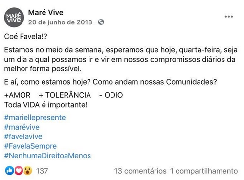 During the June 20 2018 operation in Complexo da Maré, Coletivo Maré Vive made its first post at 6 a.m. in its Facebook page, greeting the favela.