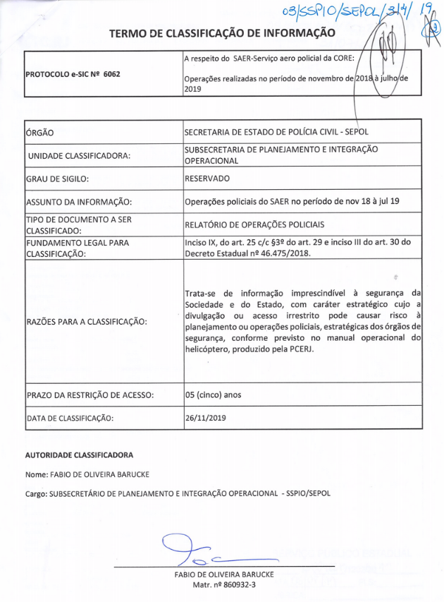 In reaction to LAI requests carried out by this research, the State government classified as secret the basic data regarding Civil Police operations carried out with a helicopter until November 2024.