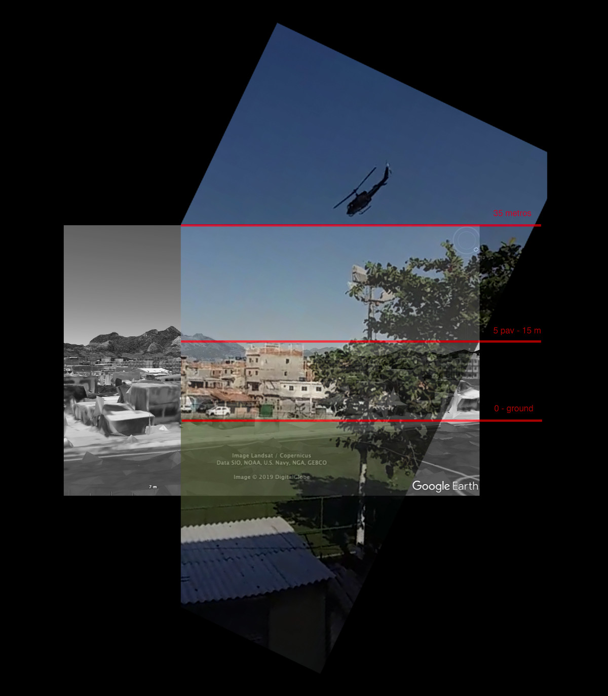 Analysing images of the operation, it was possible to make an estimate of the helicopter's height. In the photograph, it is approximately at 35 meters from the ground, as high as the eleventh floor of a building.